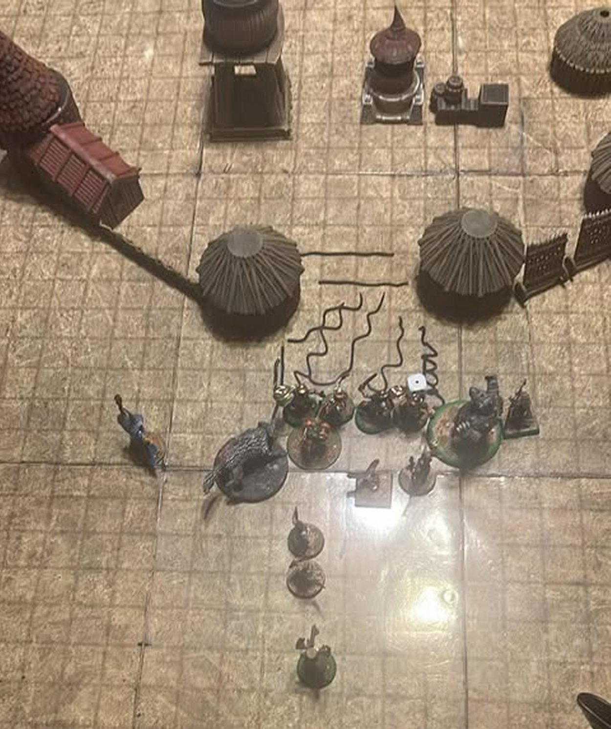 Having run the blockade, the PCs head to a small village where they fought the forces of the Titans. These forces included hoplites and a mercenary mage. A rather impressive battle.