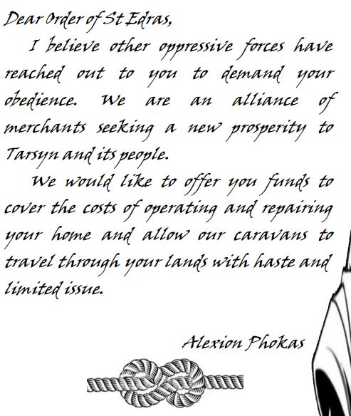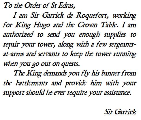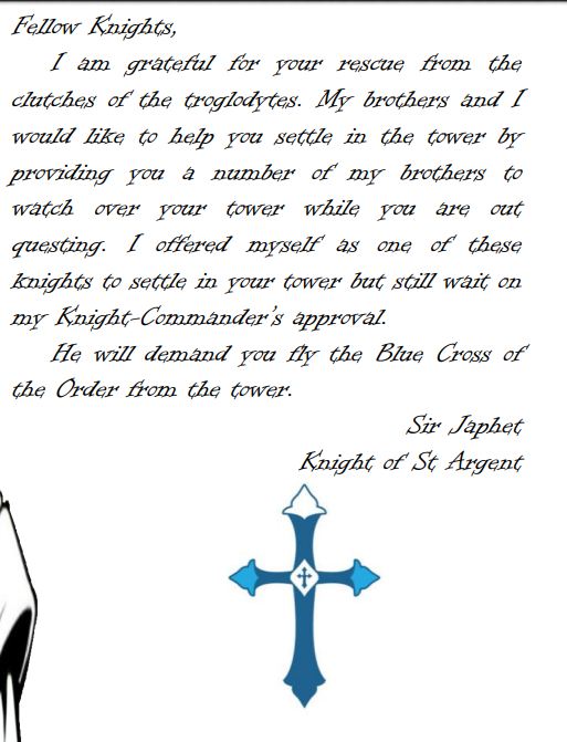 After clearing the Tower of St Edras, our heroes decided to settle here. They received three offer letters to receive funds and money to help fix the tower.